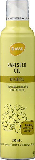 Neutraali DAVA Rapsiöljyspray 200 ml on kätevä jokapäiväiseen paistamiseen ja kesän grillailuun – kerran kokeiltua tästä on mahdoton luopua! Rapsiöljy on lämpöstabiilia, sillä sen savuamispiste on korkea, yli 220 °C. Sitä voidaan käyttää paistamiseen, sillä öljy säilyttää hyvät rasvahapponsa korkeissa lämpötiloissa. Sisältää runsaasti E-vitamiinia ja omega-3 rasvahappoja.